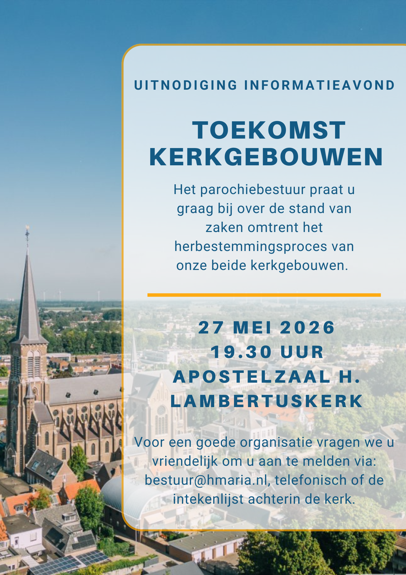Het parochiebestuur praat u graag bij over de stand van zaken omtrent het herbestemmingsproces van onze beide kerkgebouwen op woensdag 27 mei om 19.30 uur in de Apostelzaal van de H.Lambertuskerk.